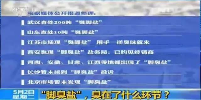 近期,江苏、山东、湖北、陕西等多个省份的市场上出现了“臭脚盐”,打开包装后的食盐散发出一股臭味。涉嫌生产“臭脚盐”的河南平顶山神鹰盐业相关负责人曾表示,生产时没有去除掉岩盐中的丁酸,它对人体健康有益。然而,国家标准要求食盐“无异味”,“臭脚盐”质量不合格应无疑义。各地稽查部门已开展市场排查,要求商家对问题盐品立即下架。