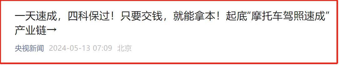 很多人表示考驾照费时费力,但是不考骑电动车上路,交警查到又要处罚,属于进退两难。为此多地推出送考下乡活动,方便车主考证、拿证。然而近日央视却曝光了一起关于摩托车考驾照的乱象,不少驾校承诺“一天拿本”,背后却涉及了一条灰色产业链。