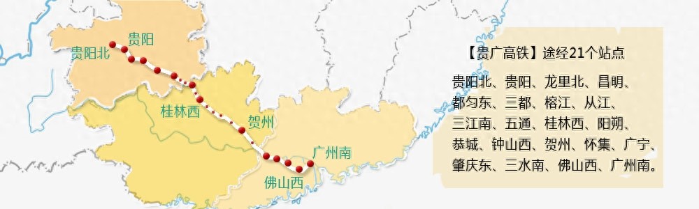 途经站点:贵阳北—贵阳—龙里北—昌明—都匀东—三都—榕江—从江—三江—五通—桂林北(非正线上) —阳朔—恭城—钟山西—贺州—怀集—广宁—肇庆东—三水南—佛山西—广州南