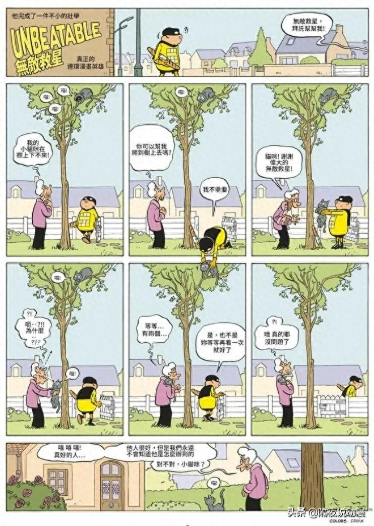 看到了吗,主角趁着老奶奶不注意,愣是越过了漫画的分镜框,随手便在自己脚下的一页分镜中把困在树上的小猫咪给救了下来,关键这剧情的发展顺序还非常合乎逻辑。