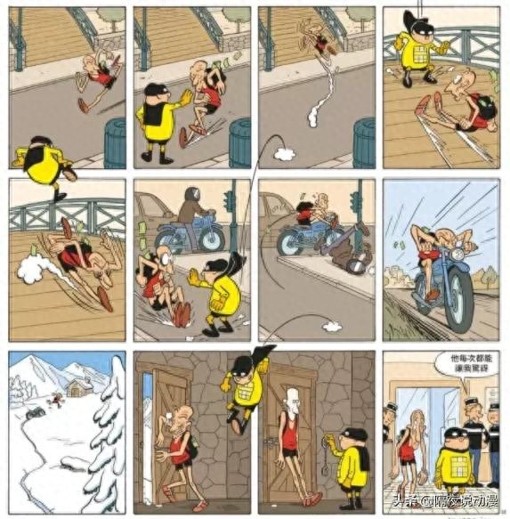 还有接下来的这篇“制服歹徒”的故事,一早上无敌救星正在准备着早餐,突然透过下面的分镜发现有两个歹徒正在对着一对母子实施抢劫,于是无敌救星跳下去“从天而降”。