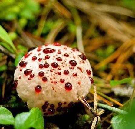 真菌家族另一个不同寻常的成员——血牙真菌,它还有许多不同的名字,都和橘子或者血有关。这种真菌常见于美国,尤其是西北太平洋地区,也是通常生长在松树林中。它也被发现存在于欧洲,最近又在伊朗和韩国被发现。刚一看到,你会以为它的菌盖上面鲜红色的液体是哪个可怜的动物路过时溅在它白色的菌盖上的。但观察的仔细一些,你就会发现,这是从它自己的气孔中渗出的液体。