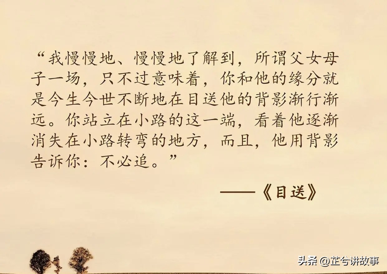 龙应台的文笔,可以说站到了文字的神坛上,她在书中有很多经典描述,其中有一段是这样描写的:所谓父女一场,只不过意味着,你和他的缘分就是今生今世不断地在目送他的背影渐行渐远。