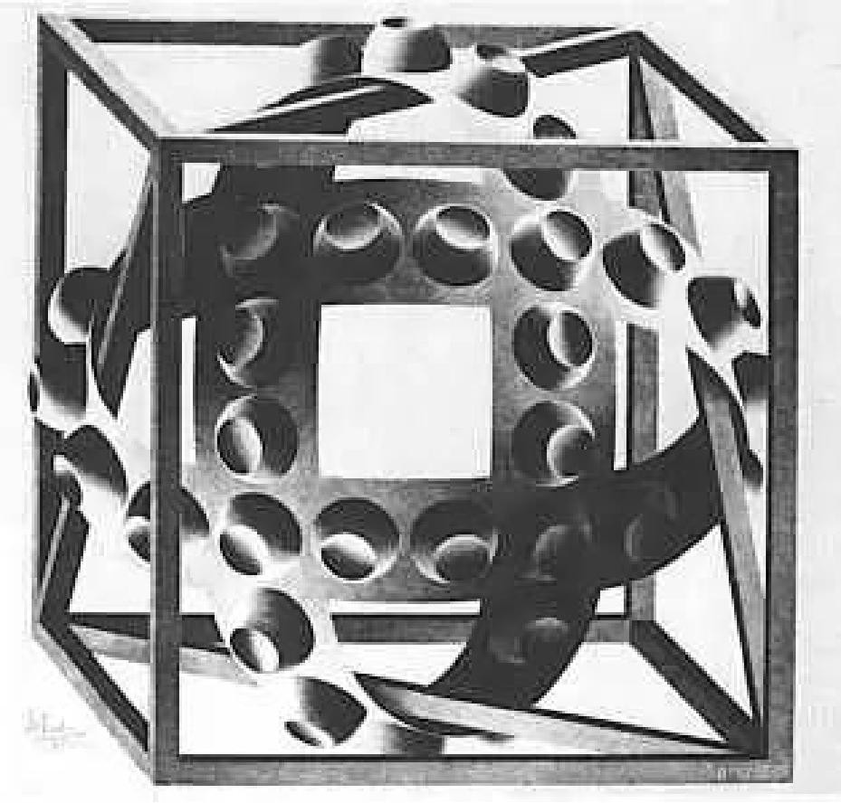 这幅画看起来好像两个相套又分离的莫比乌斯带,又好像这两个带子是连在一起的,带子上面连续嵌着的各个圆台好像是凸的,又像是凹的,让人玩味不已。