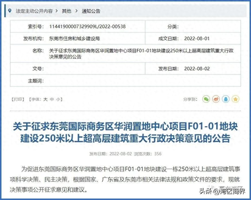 8月2日,东莞市住建局发布《关于征求东莞国际商务区华润置地中心项目F01-01地块建设250米以上超高层建筑重大行政决策意见的公告》。