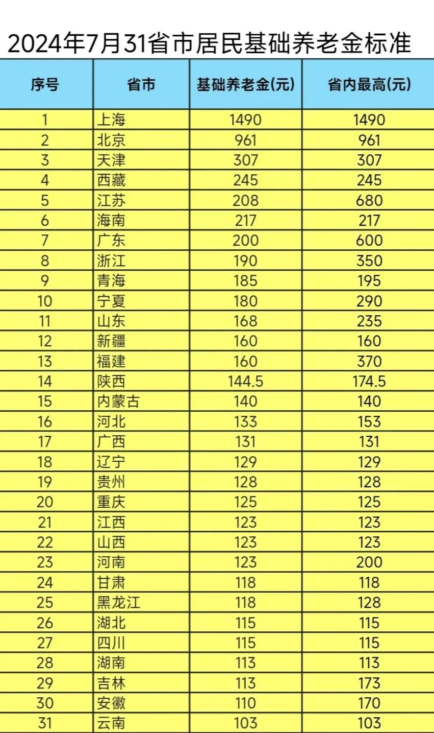二、各省居民基础养老金水平一览