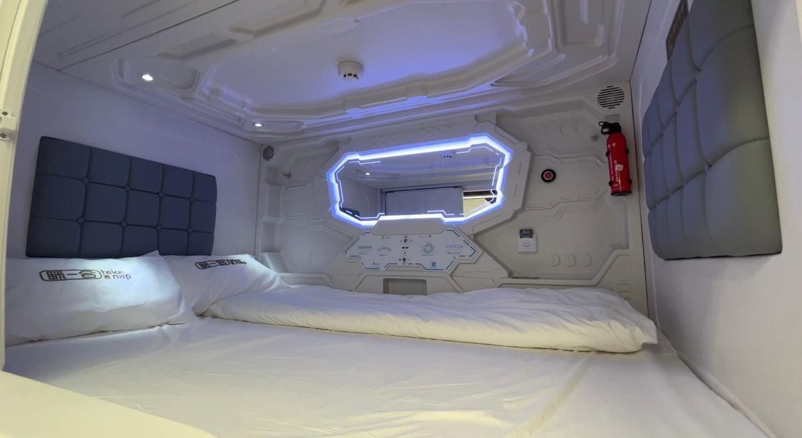 优选单人舱长约2.1米、宽约1.2米、高约1.2米。九派新闻记者在舱内看到,新风系统、充电插座、氛围灯、阅读灯、镜子、小型保险箱、Wi-Fi和小型灭火器等设施一应俱全,床垫采用了记忆棉材质。一米七的成人躺平之后,位置还有富余,坐起来不会碰头,拉上门就是一个独立的空间,也比较安静。