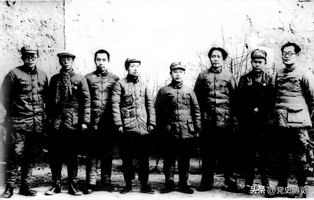 1937年12月,中共中央在延安召开政治局会议。图为出席会议的部分人员合影。左起:张闻天、康生、周恩来、凯丰、王明、毛泽东、任弼时、张国焘