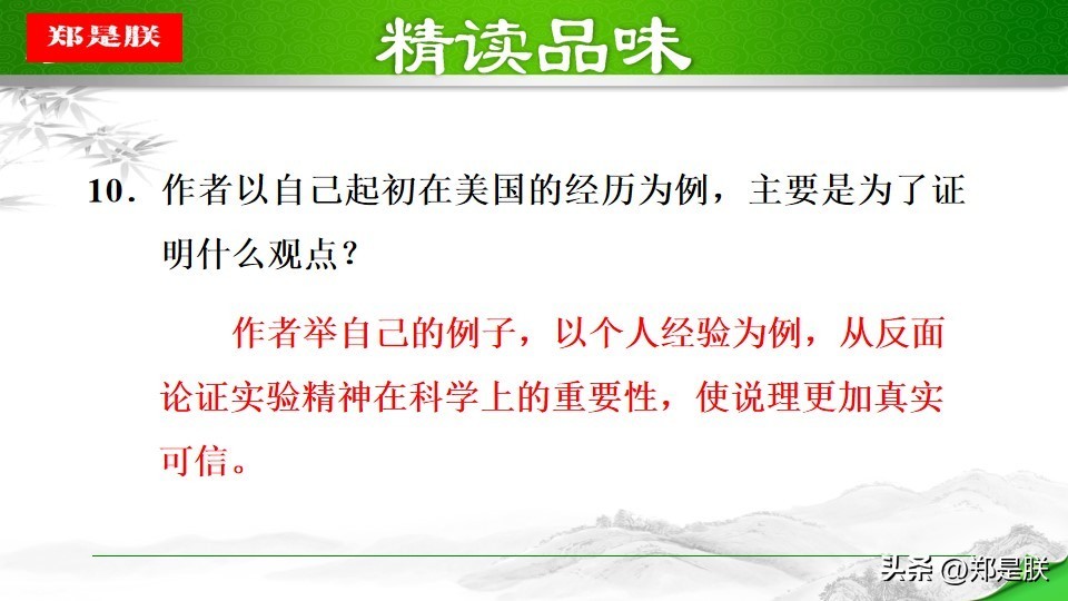 本题运用举例论证作用分析法解答。作者现身说法,以自己在美国求学的例子证明中国传统教育重理论轻实践、重思维轻动手的弊端,再次说明实践在科学研究中的重要性,使说理更加真实可信、无可辩驳。
