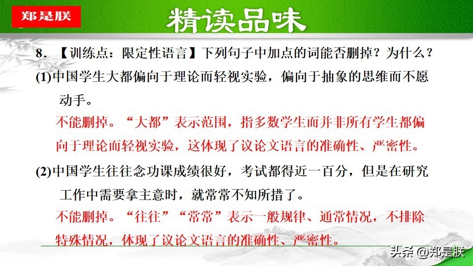 本题运用议论文修饰限制性词语作用分析法解答。“大都”指明了范围,“往往”和“常常”则指出了频率上的多。这些词语突出了传统的中国教育对学生的不良影响的普遍性,语言准确严密。