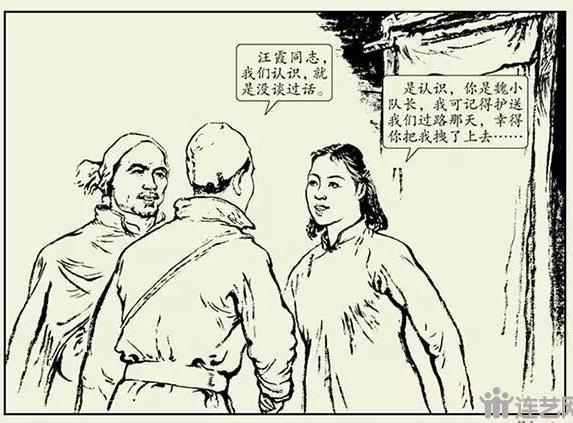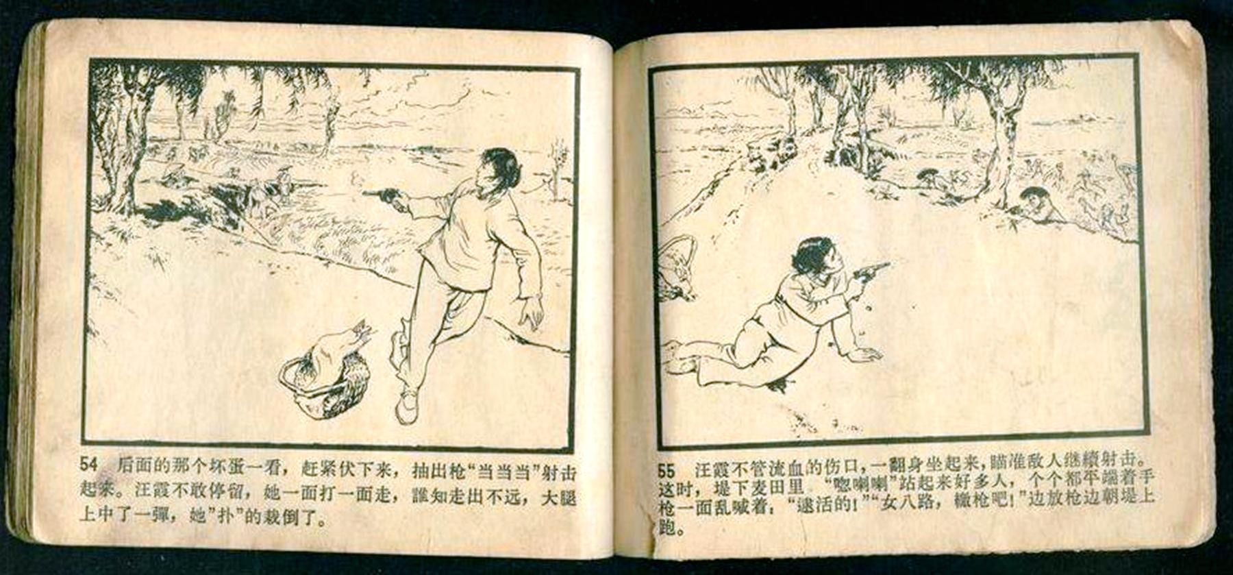 《敌后武工队》小人书描绘的区委女干部汪霞在路上遭遇敌人伏击,用小手枪奋起还击的情景。在书中她爱上魏强