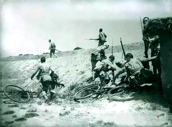 抗日战争时期冀中地区敌后武工队追击伪军,收缴伪军逃跑中丢弃的自行车和武器(图源:保定革命纪念馆)
