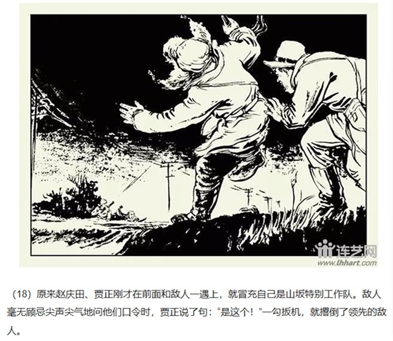 “口令?”贾正的枪口瞄准了他,见他越走越近,说了句:“是这个!”一勾扳机,叭咕一声,领先的敌人被撂倒;赵庆田也叭咕一声,也撂倒了一个,接着又甩出一颗手榴弹,轰地爆炸了。他借着手榴弹爆炸的浓烟,三跳两蹦地窜到了敌人屁股后面。