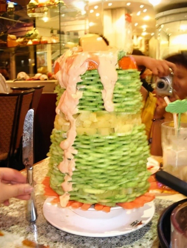 他们用「垒沙拉塔」的方式向小小的沙拉碗宣战,他们用各种建筑的技巧,用蔬菜和水果垒出了一座座九层妖塔,并且把自己的建筑方案上传到社区贴吧里,成为了早年互联网上一个著名的挑战。