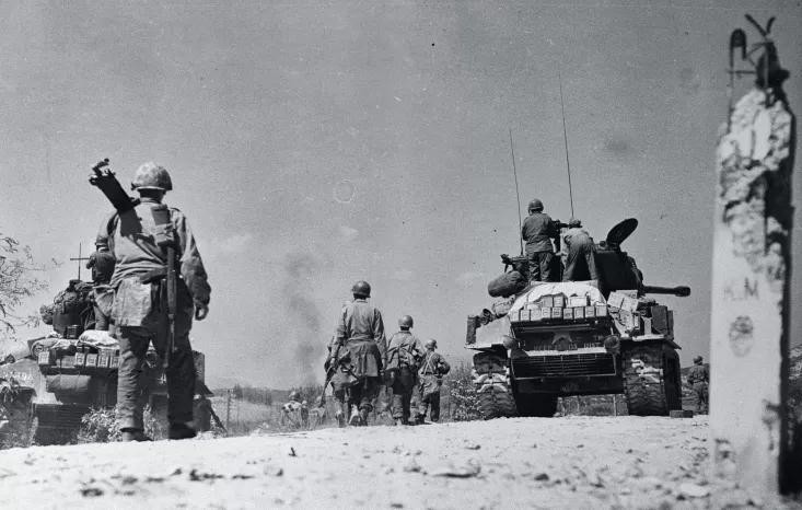 1950年10月,大举向平壤推进的美军,右边的一辆谢尔曼坦克正在向朝鲜阵地开火