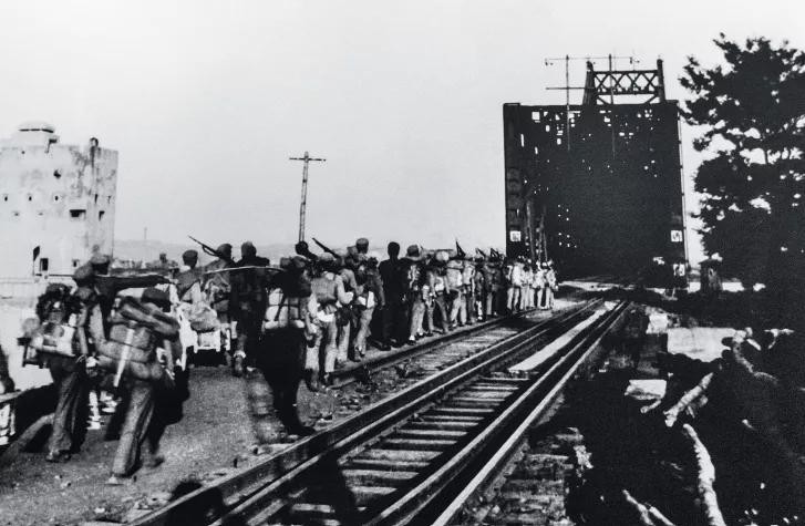 历史会记住这一刻。1950年10月18日,中共中央政治局会议正式作出决定“中国人民志愿军按预定计划于十九日跨过鸭绿江入朝作战”。第二天黄昏,在萧瑟的秋风里,志愿军分三路跨过鸭绿江,秘密开赴厮杀正酣的朝鲜战场:40军和39军主力及炮兵1师从安东(今辽宁丹东)渡过鸭绿江;39军117师、炮兵2师和高炮团从长甸河口(位于今辽宁省丹东市宽甸满族自治县)渡江;38军、42军和炮兵8师从辑安(今吉林集安)过江。所有渡江部队都遵照毛泽东的电令,严格保密,从每日黄昏开始行动到翌日4时停止,白天隐蔽。至22日晚,由4个军及3个炮兵师所组成的强大兵力,已经进入朝鲜战场。