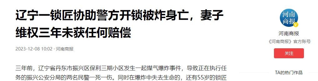 河南商报:辽宁一锁匠协助警方开锁被炸身亡,妻子维权三年未获任何赔偿
