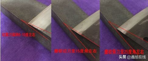 对于切片刀、斩切刀,磨刀角度(刀面与磨石面间的夹角)以10至20度为佳。对于砍骨刀,磨刀角度以30度左右为佳。如下图示