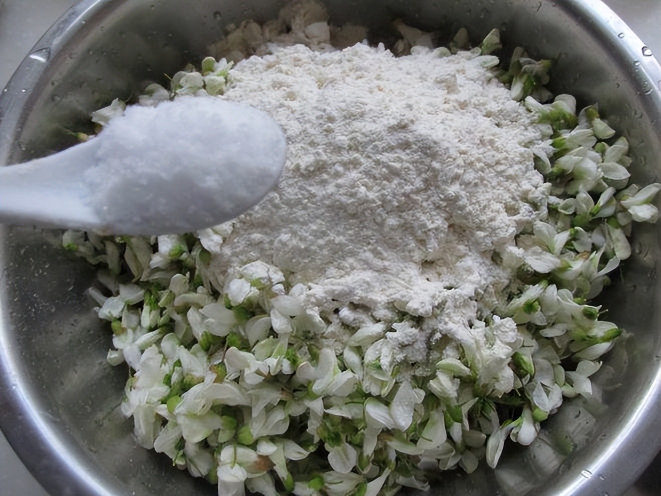 1.首先准备新鲜的槐花500克放在清水中给它冲洗干净。清洗好的槐花放在漏勺中给它控干水分。然后在里面加入三克精盐,给他调味。