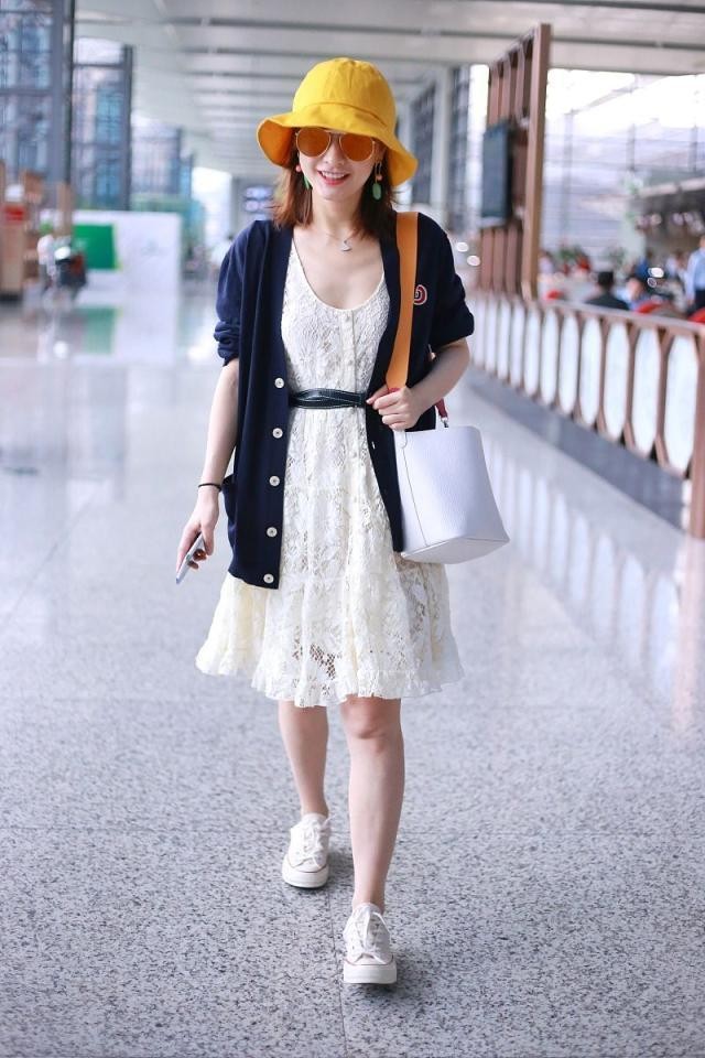 当然,这套造型特别减龄。利用黄色帽子来提升造型亮度,利用黑色开衫来达到显瘦的目的,利用白色蕾丝裙形成一种浪漫可爱的气息。这样的组合适合春天和夏天,几乎没什么难度,而且跟小个子也很相配。