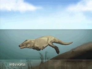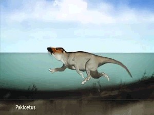 自此,这类古兽像是发现新大陆一样,开始在海洋中拓展自己的生态位,慢慢的它们一部分开始进化出能适应水中生活的器官,比如进化出强壮尾部和长浆状后肢的游走鲸。游走鲸,是巴基鲸更进一步适应海洋的鲸类,长约3米,头大,吻突长,眼位于头部背侧面。研究表明,游走鲸生活在浅海中,并且和现代鲸一样能够饮用海水。