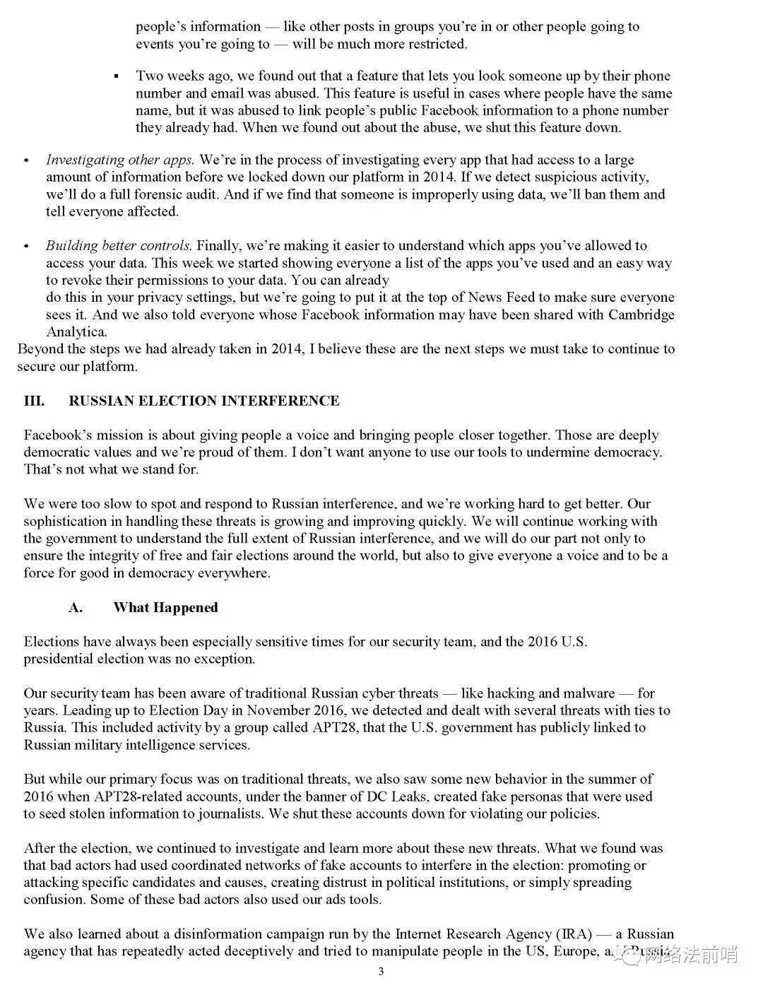 我们对俄罗斯干预大选之事反应不够迅速,而且也未能及时地采取回应措施,如今,我们正在努力做得更好。我们在处理这些威胁方面已经显得越来越成熟,而且处理能力也在迅速提高。我们将继续与政府合作,以弄清俄罗斯干预大选的整个细节,我们还要尽力,不仅要确保全世界自由与公平选举的完整性,而且还要让所有人表达他们的声音,同时还要成为推动全球各地民主制度变得更好的动力。