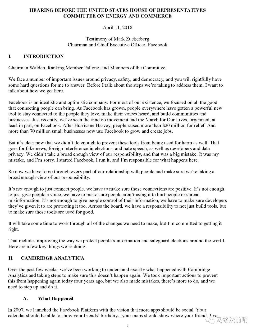 马克•扎克伯格为美国众议院能源和商业委员会听证会准备的书面证词