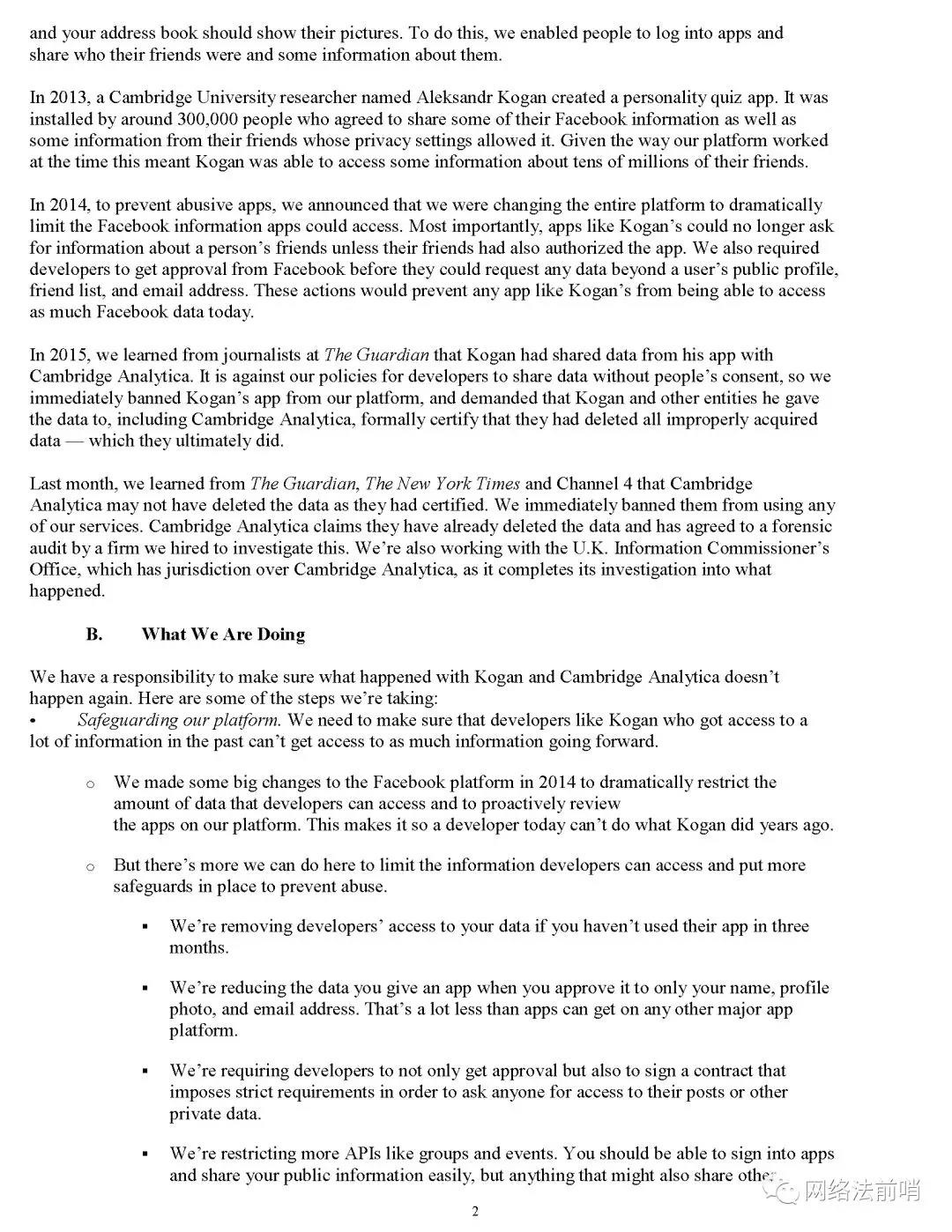 1、我们已经于2014对Facebook平台进行了重大调整,大幅限制开发者能够获取的数据数量,并积极审查我们平台上的各种应用,这些举措让如今的开发者无法再复制科根几年前的行为。