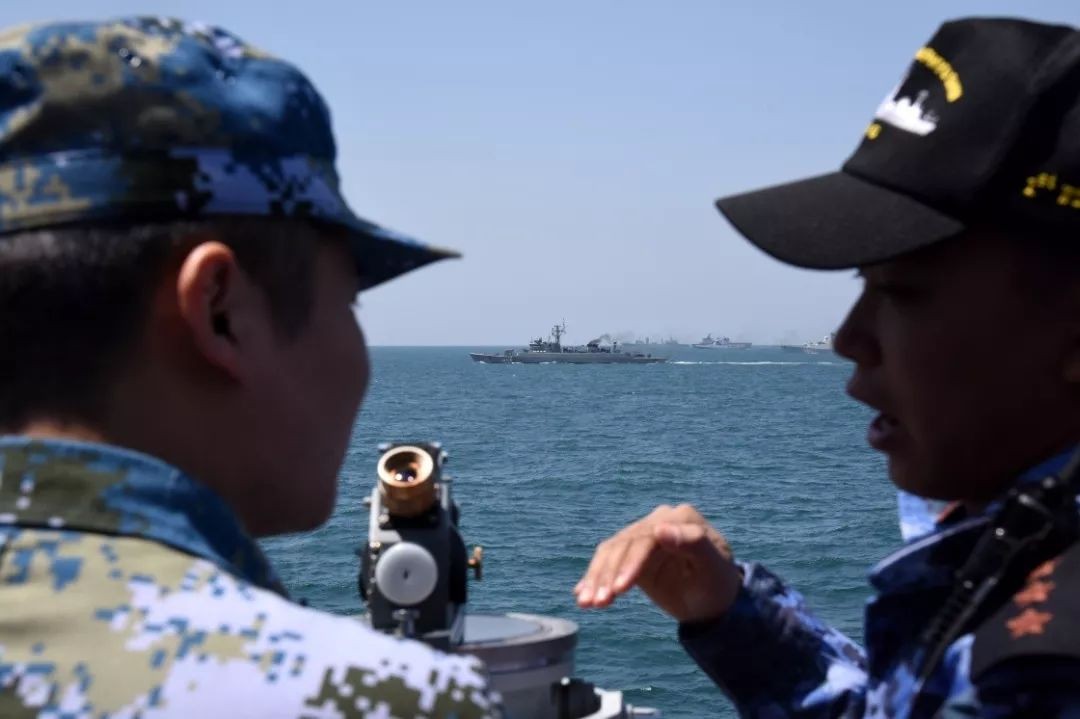4月26日,在人员换乘课目中,中方人员搭乘小艇前往外军舰船。