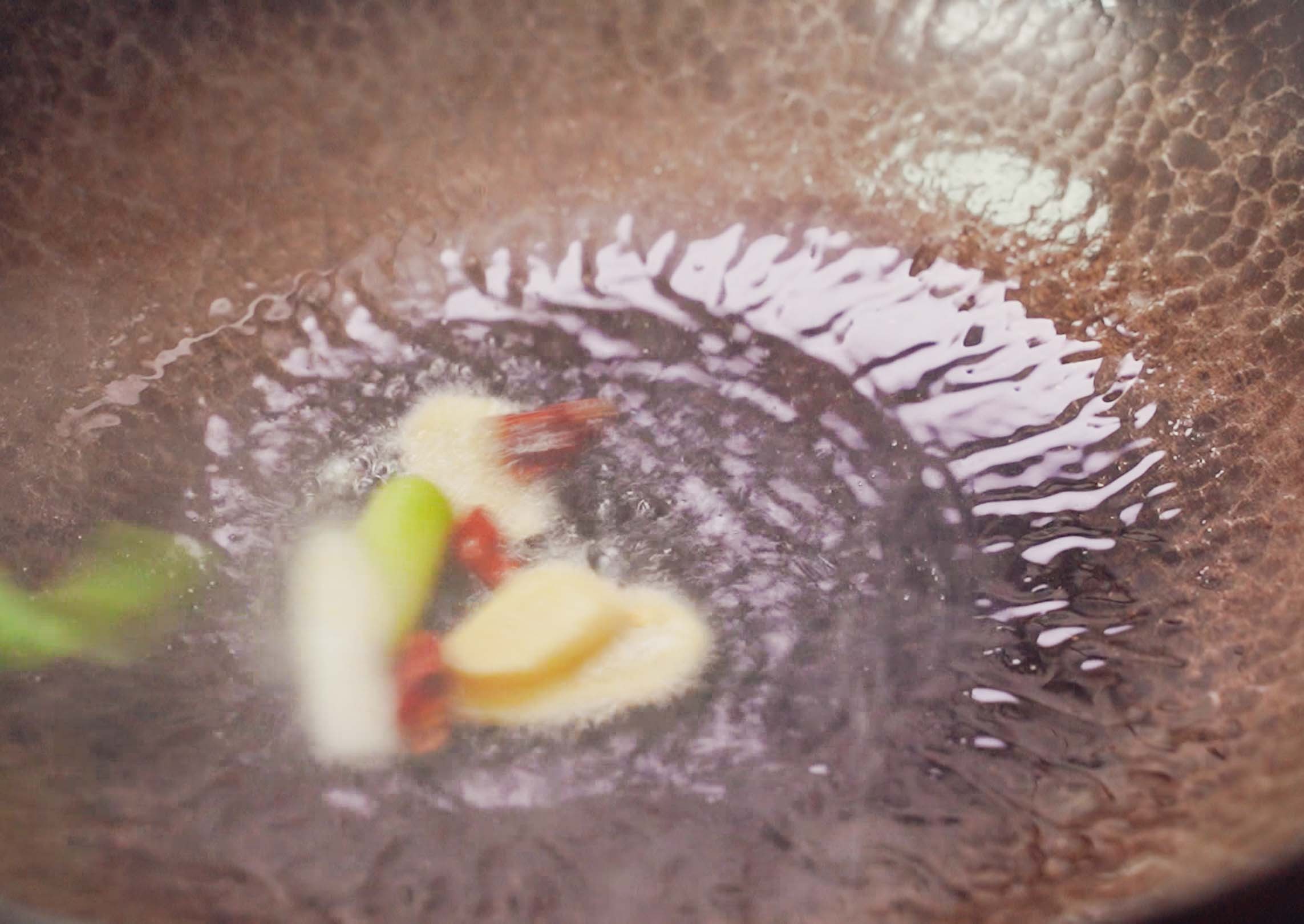 锅中留有底油,下入干辣椒,姜葱蒜爆香,主要就是去腥增香的作用。