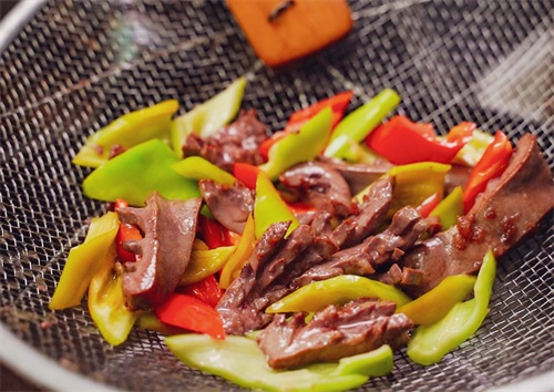 看到腰花和青椒基本成型成熟既可以捞出来,控干油份。