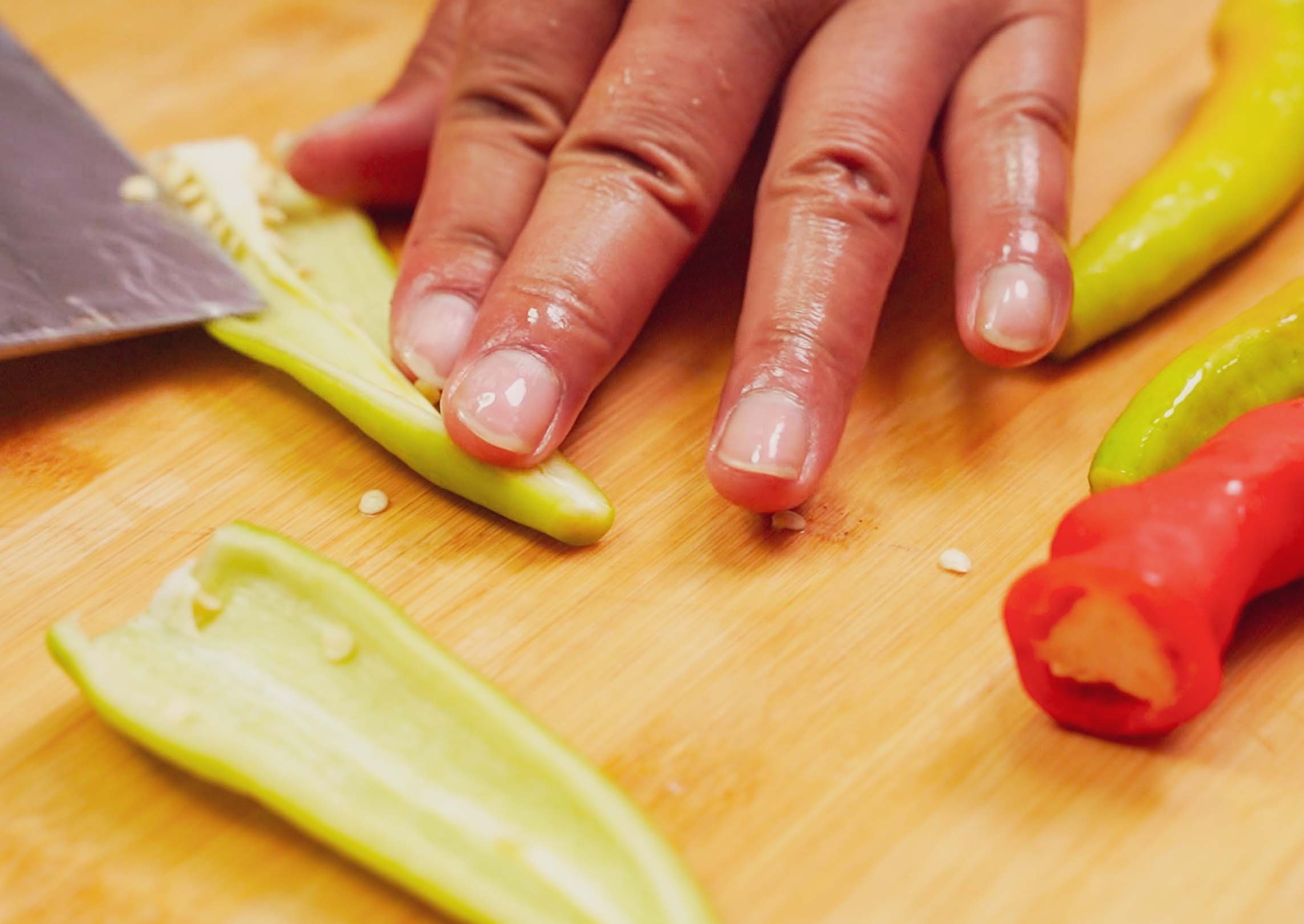 将买来的青红椒去籽儿,洗干净,用刀切成小块儿,
