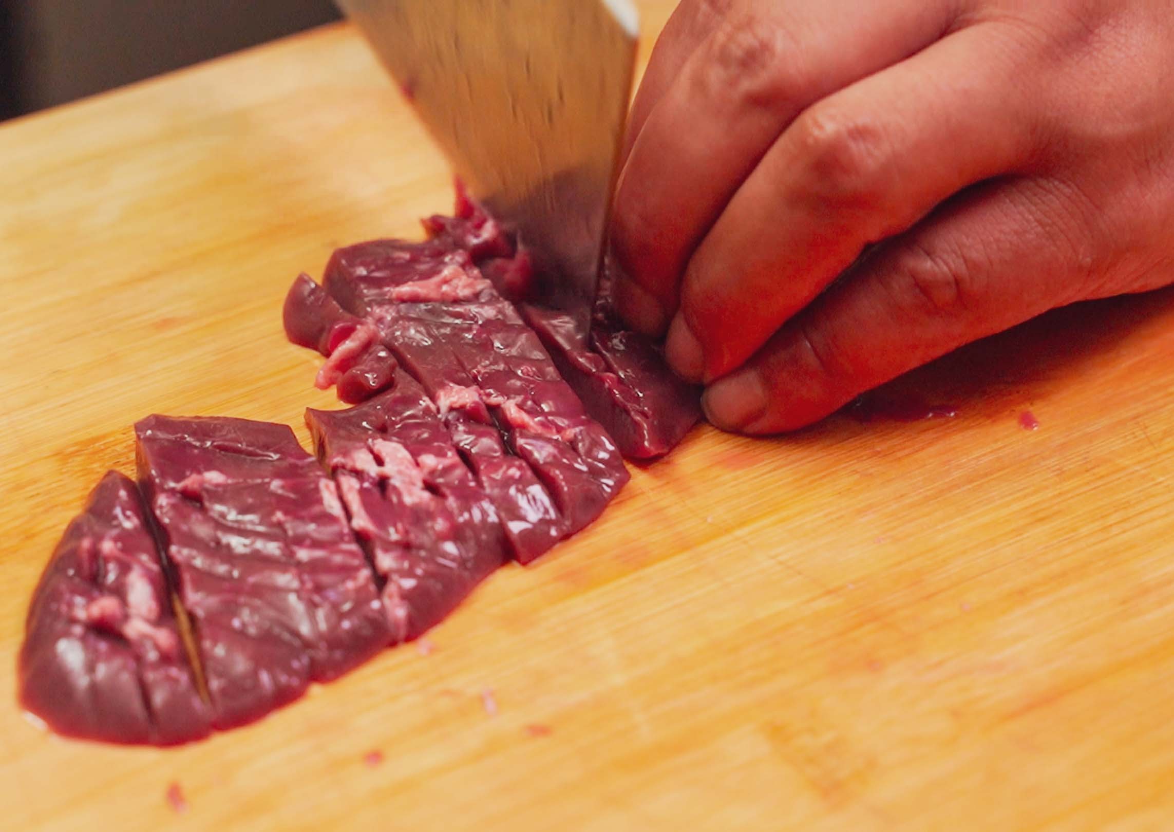然后去除腰骚味,再将处理好的猪腰打上花刀,切成大小均匀的条。