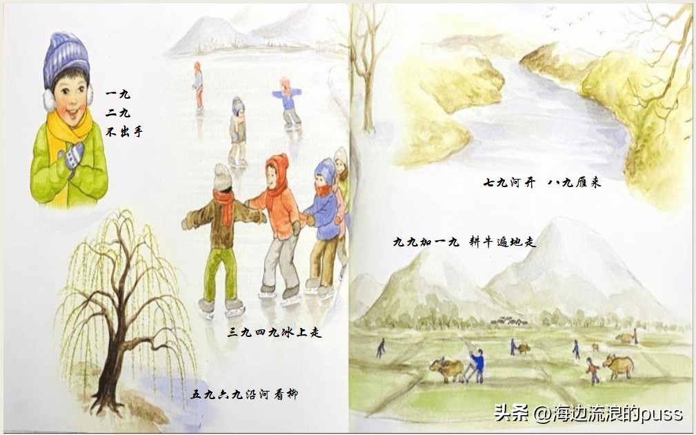 “九九歌”的内容有很多版本,谨以我家乡的为例:“一九二九冰上走,三九四九冻破石头,五九六九沿河看柳,七九河开,八九雁来,九九耕牛遍地走。”