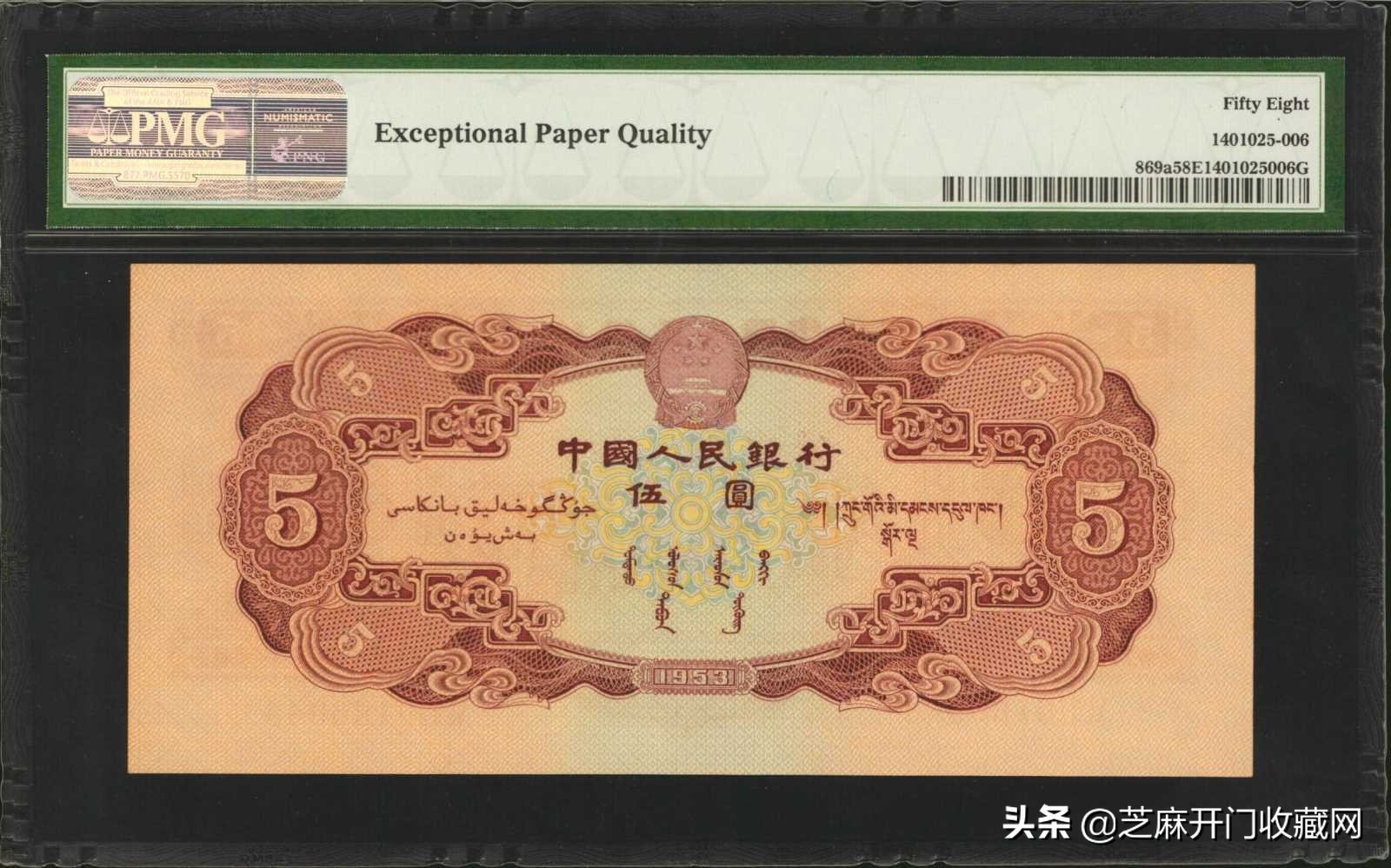 1953年第二版人民币伍圆 PMG Choice AU ,估价: USD 3000 - 3500,成交价格: USD 3360