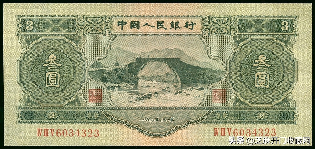 二版人民币3元,编号IV III V 6034323,AU品相,少见 ,估价: HKD 10000 - 15000,成交价格:HKD 31200