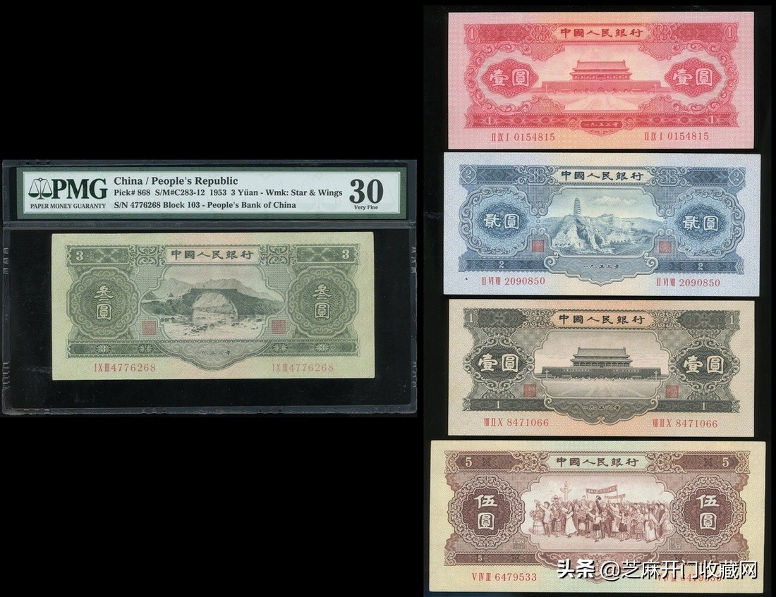 1953-56年二版人民币5枚一组,包括53年1、2、3元及56年1丶5元(星水印),成交价格: HKD 20400