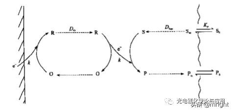 在这一机制中,基质S穿过聚合物薄膜/电解液界面进行传输,其首先扩散到聚合物薄膜中。另一方面,电催化剂或媒介体,R/O,在电极表面经过很快的异相电子转移,电荷以一定速度也传递通过聚合物薄膜。二者在聚合物膜中发生反应,即电催化过程。这种过程也被称为外壳层反应。
