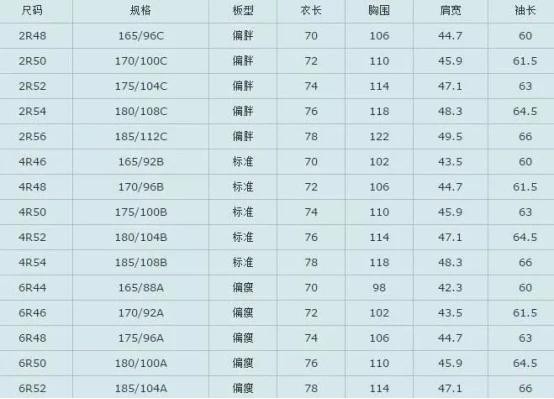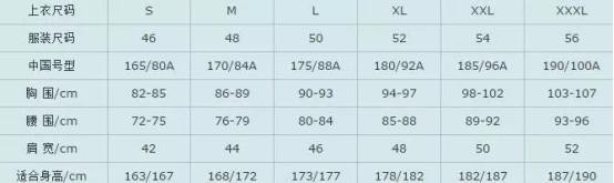 8、西装尺码对照表