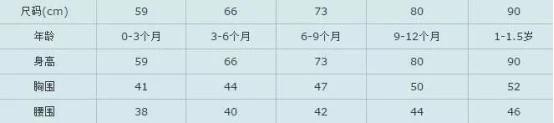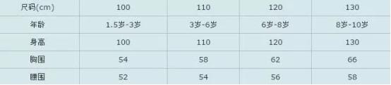 注意:表格中尺码项即为小孩身高,请顾客按照尺码项选择合适的码数,宝贝幼嫩肌肤。