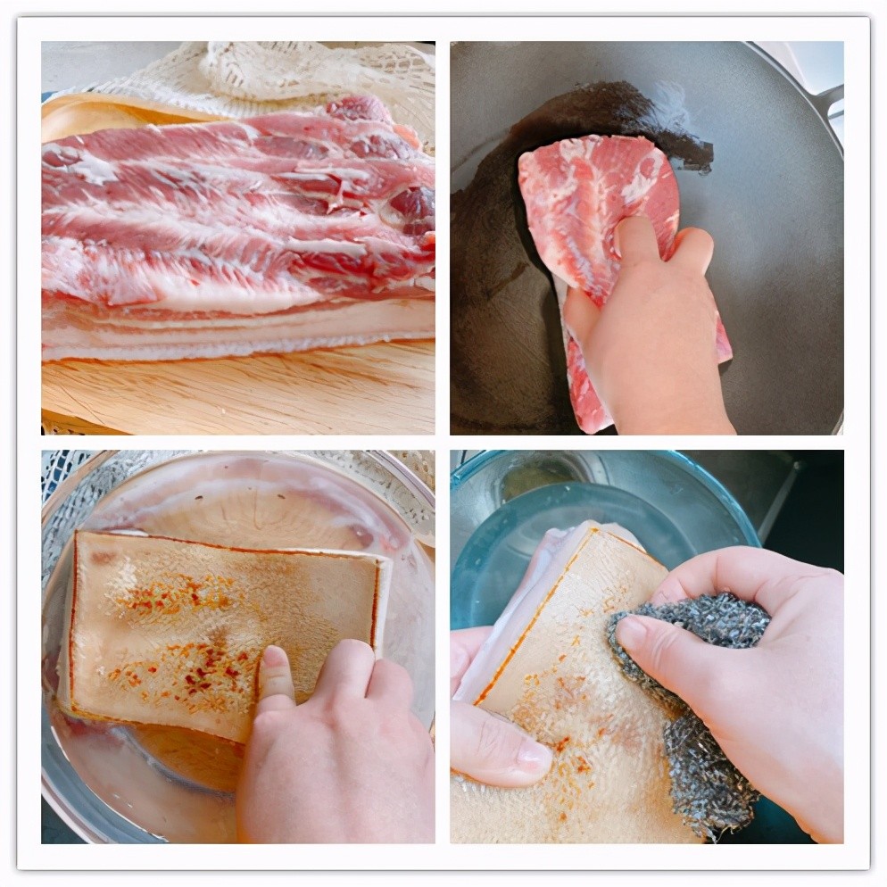 1、准备好的五花肉先烙一下皮,铁锅烧热,把五花肉皮朝下,来回的擦拭,烙皮是为了烧掉多余的皮毛,还能去腥;