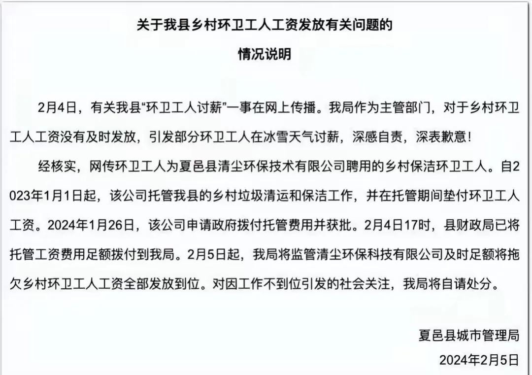 随着事件的持续发酵,2月5日,夏邑县城市管理局作出回应,在说明中,夏邑县城市管理局显示对此次事件表示了歉意,并表示县里的乡村垃圾清运和保洁工作是外雇的,2月4日17时,财政局就已经把钱达到了城市管理局,说明中还承诺,自2月5日起,城市管理局会监督外雇公司给环卫工人发工资,确保所有人工资到位。