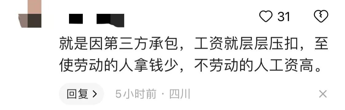 “就是因为第三方承包,工资就层层压扣,致使劳动的人拿钱少,不劳动的人工资高。”