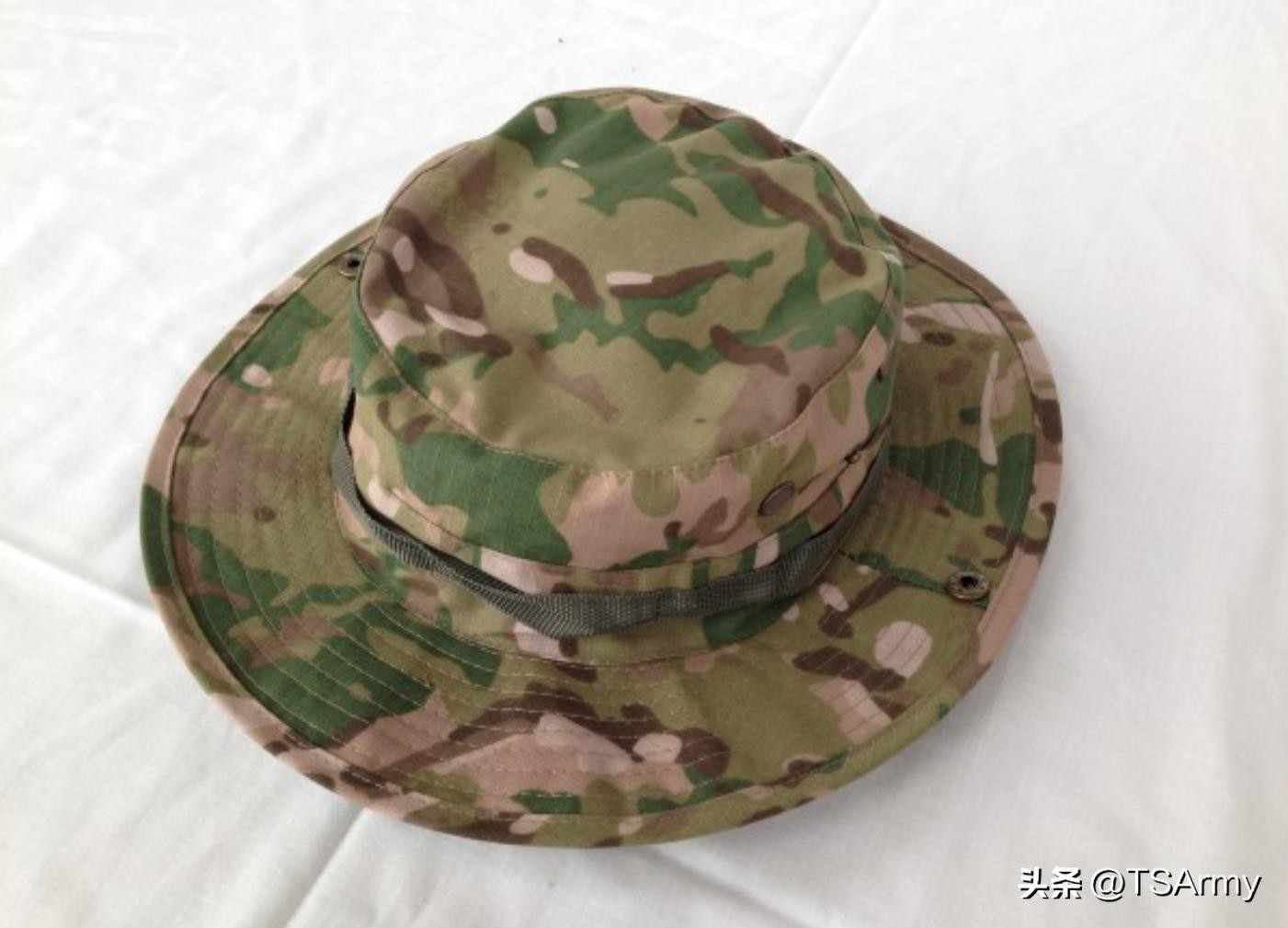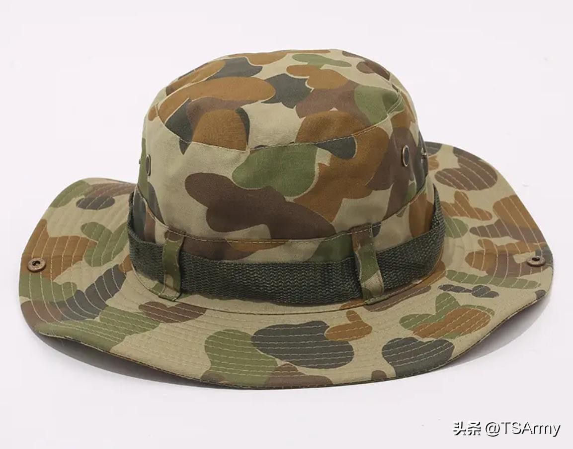 澳大利亚军队一直都很喜欢使用奔尼帽,不管是在训练还是官兵日常工作,都是佩戴他们制式的DPCU斑块迷彩奔尼帽,并分为短帽檐款和标准款,上图就是短帽檐款,外形和英军的奔尼帽有些相似。