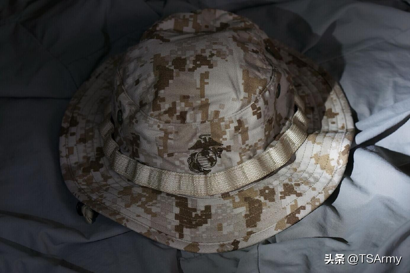 陆战队还有第二种数码迷彩奔尼帽,主要是针对沙漠环境使用,也属于MCCUU数码迷彩的一种,而且这也是当年美军陆战队在中东地区最常用的款式。