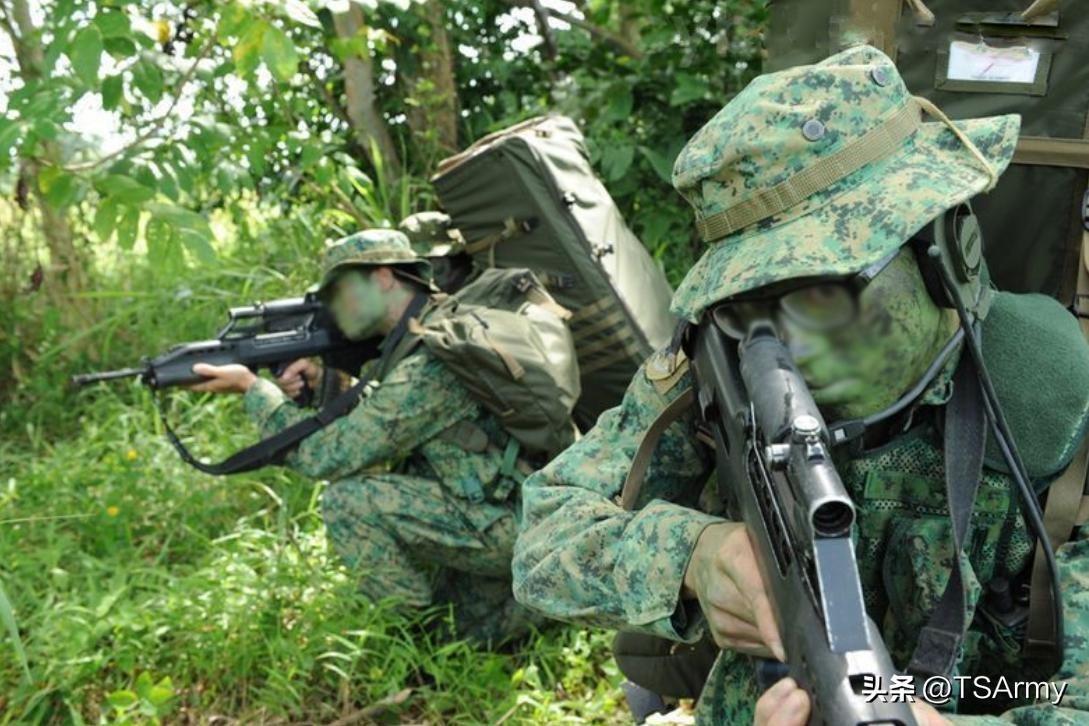 上图是正在训练的新加坡陆军士兵,头上佩戴的就是SAFPAT温带林地数码迷彩奔尼帽。