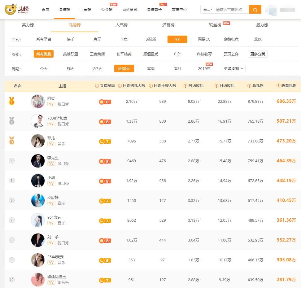 YY主播收入排行榜:阿哲流水超六百万,五位女主播上榜