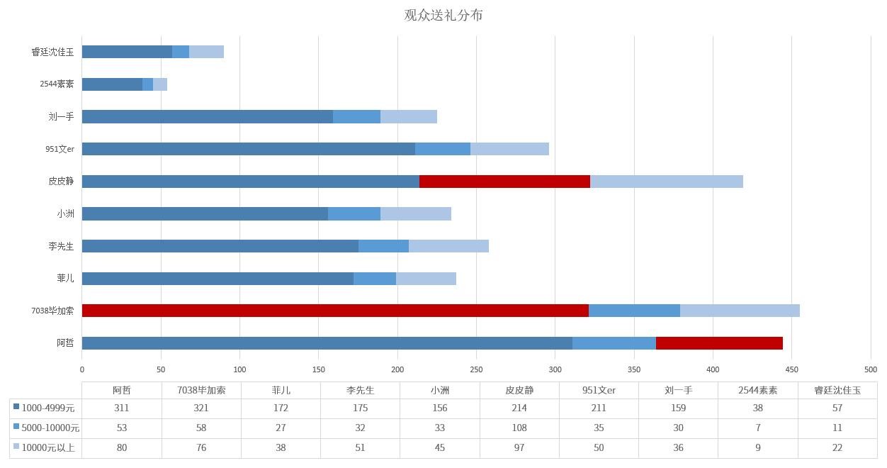 在观众送礼金额分布图中显示,阿哲在万元以上的送礼用户最多,这也正对应了他有着最高的财团输出量。收入榜排行第二名的毕加索则是在1000-5000元区间段额送礼人数最多,且他在其余两个分段的人数分布与阿哲相差并不多。甚至于在1000元以上送礼观众分布人数中,阿哲仅能排行第三位,第一名的是皮皮静。但正是万元以上输出用户贡献金额足够大,也可以说阿哲拥有更多"神豪"支持,才让他稳坐收入榜冠军。