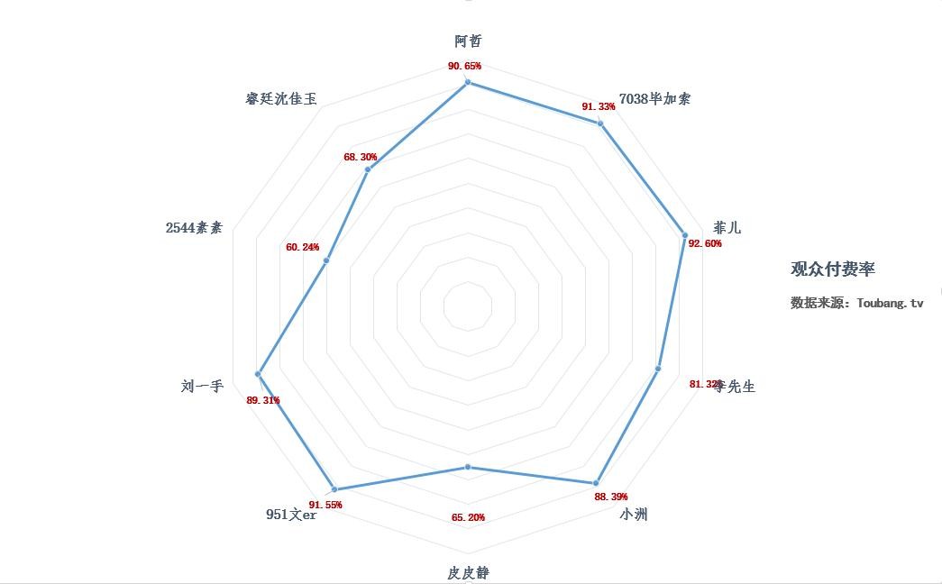 且近三十天直播间观众付费率数据显示,菲儿直播间观众付费率高达92.6%,甚至超过了人气与收入都在她前面的阿哲、毕加索,居十位主播之最。在上榜女主播中,她与文er二人的观众付费率超过九成外,剩余三人,付费率均在70%以下,对比YY大盘偏低。