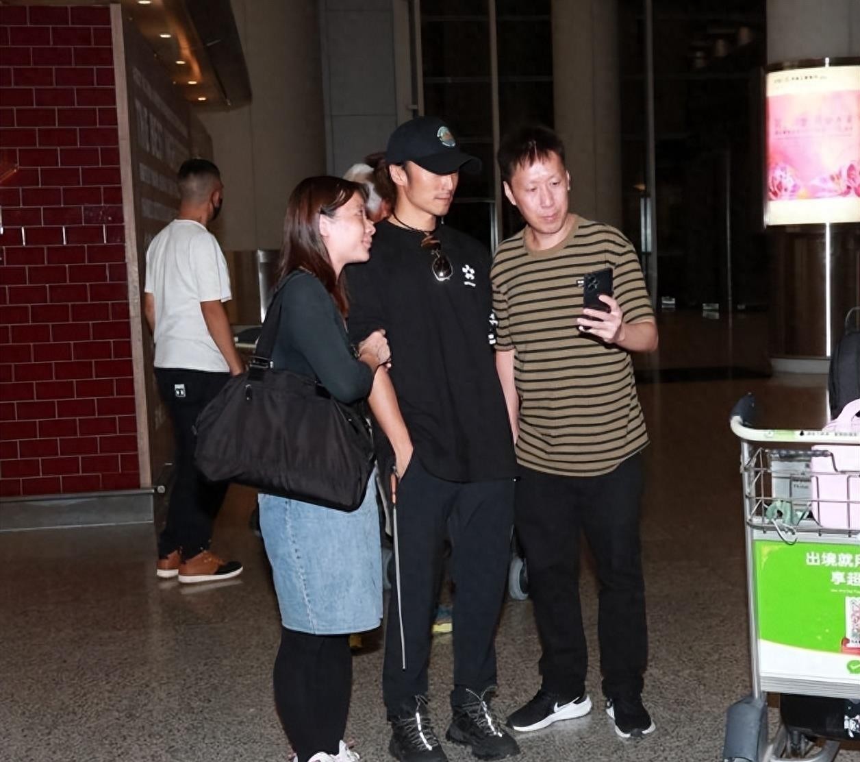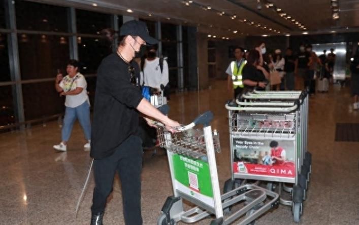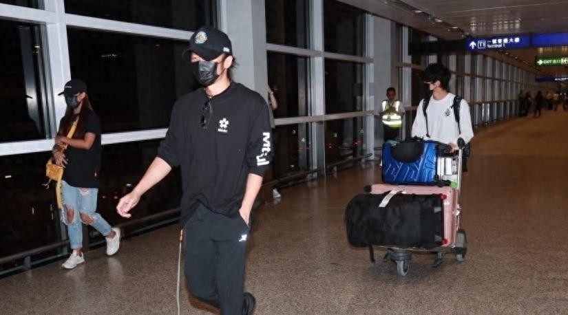 谢霆锋下飞机找到记者时,将行李车交给助手“表弟”,优雅地走在前面,引来记者拍照,并把儿子挡在身后。